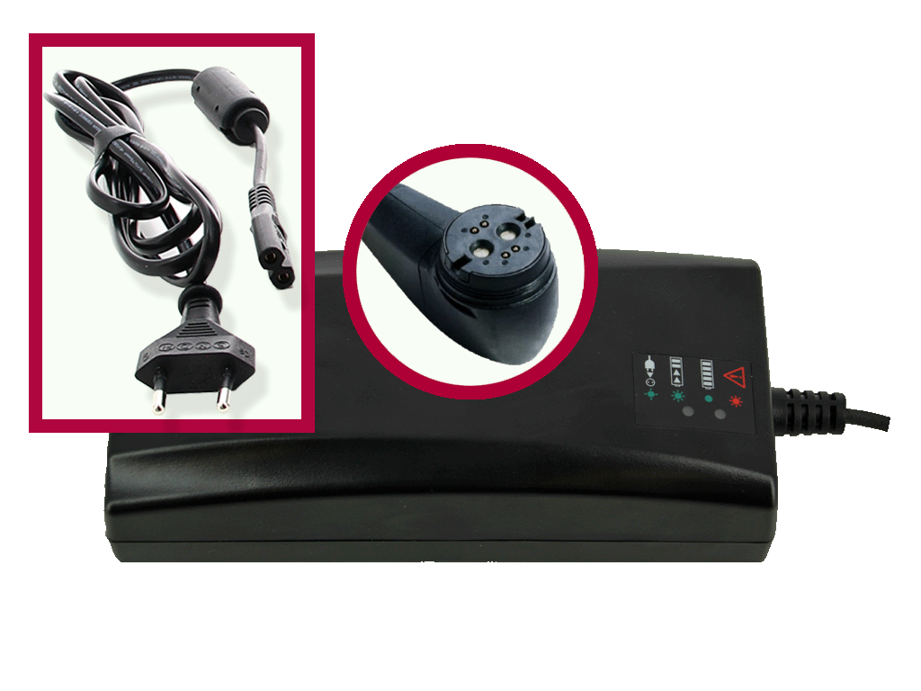 Derby Cycle Ladegerät für Lithium-Ionen Akkus mit Ladebuchse-Anschluss 90° Rosenberger. 42 Volt Spannung, 4 Amperestunden Ladestrom.