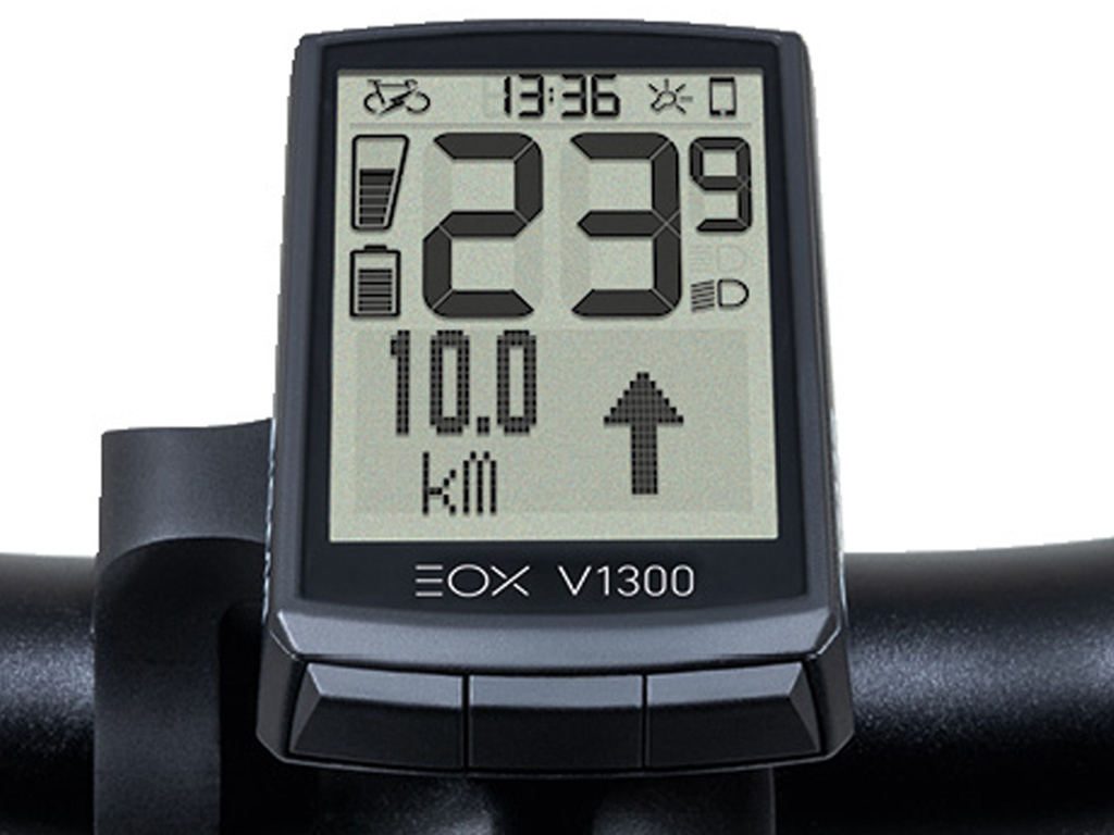 Der kabellose EOX® VIEW 1300 fügt sich mit seinem flachen Design dezent ins Gesamtbild des E-Bikes ein und sorgt für ein aufgeräumtes Cockpit. Er ist mit einer langlebigen Batterie ausgestattet und lässt sich wie ein regulärer Fahrrad Computer aus der Halterung drehen. Die sichere Datenverbindung wird durch die hoch performante ANT+ und Bluetooth-Schnittstelle gewährleistet. Mit 3 Tasten an der Unterseite ist der E-Bike Computer leicht zu bedienen. Das transflektive FSTN Display sorgt für beste Lesbarkeit auch bei direkter Sonneneinstrahlung. Ein integrierter Sensor passt die Displaybeleuchtung automatisch ans Umgebungslicht an.